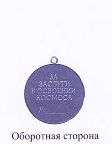 На оборотной стороне медали - надпись: "ЗА ЗАСЛУГИ В ОСВОЕНИИ КОСМОСА", под ней - номер медали.